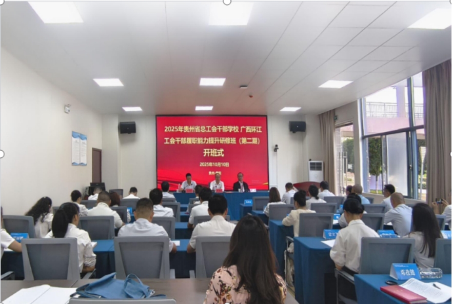 为提升新时代工会干部履职能力,助力工会工作高质量发展。2025年10月10日上午,贵州省总工会干部学校——广西环江工会干部履职能力提升研修班(第二期)在贵州交通职业大学清镇校区隆重开班。广西壮族自治区河池市环江毛南族自治县人大常委会党组副书记、副主席、自治县总工会主席欧海冠,贵州省总干校党委书记刘和邦出席开班式并讲话。开班仪式由继续教育学院培训部负责人龙茂兴主持。